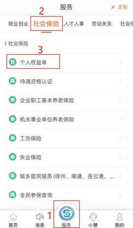 二、登录后,点击“服务”选项,接着选择“社会保险”,再点击“个人权益单”