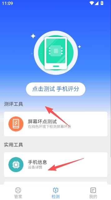 3、若需要对手机性能进行更深度的测试,可在检测功能选项里,点击测评工具与实用工具,分别对屏幕坏点测试、手机信息展开检测,等结果出来后再查看结果。