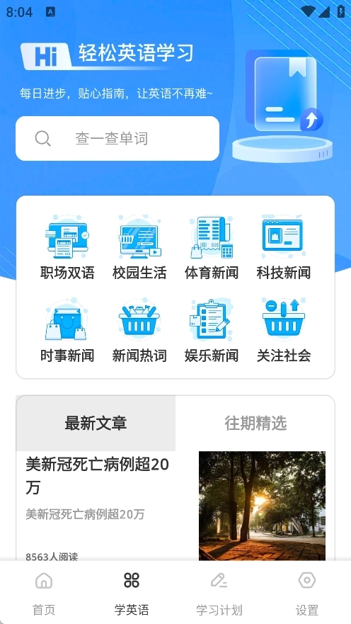 2、在学英语页面设有职场双语、校园生活、体育新闻、科技新闻、时事新闻等多个版块,同时还提供最新文章以及往期精选的资讯内容。