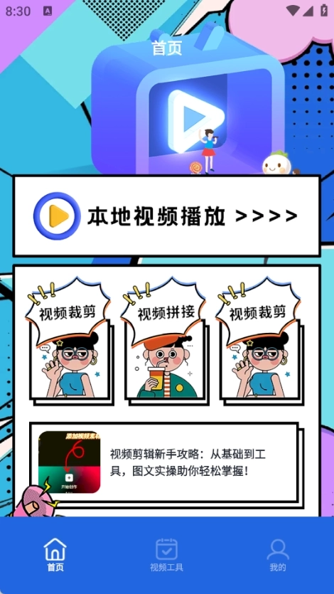 1、首页支持本地视频播放,同时提供视频裁剪、拼接等实用功能,且配备了相应的操作教程。