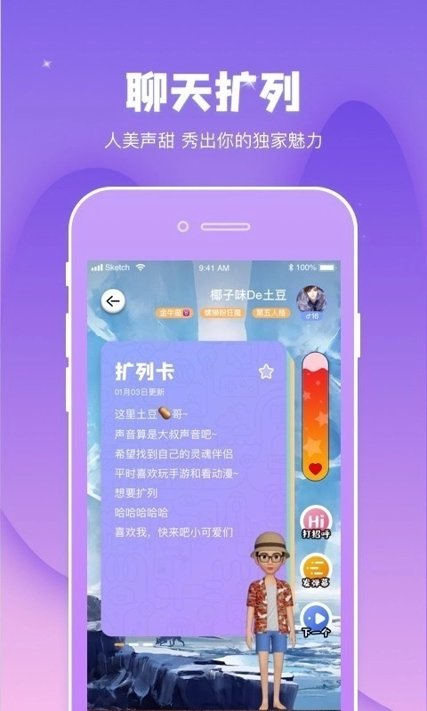 通过幸识的“扩列”功能,能够结识形形色色有趣的人。你可以发送文字消息聊天,还能和自己的虚拟形象展开互动。