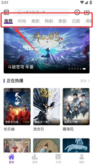 进入应用首页后,能看到推荐、内地等分类标签,方便用户浏览不同类型的剧集内容。