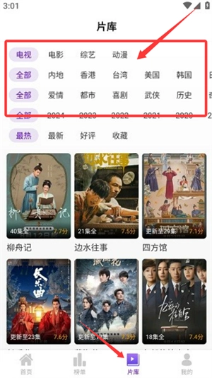 点击底部的片库页签,就能按照影视类型进行筛选,还可以根据地区和题材做更细致的查找。