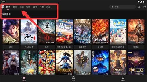 1. 开启程序,首页设有日漫、国漫等多种频道标签,可自由切换。