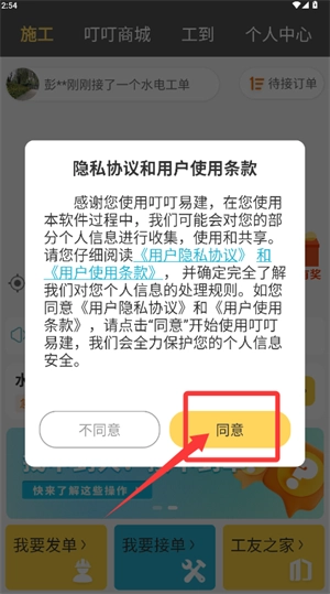 1、打开叮叮易建应用,仔细阅读隐私协议和用户条款,确认无误后点击同意按钮进入应用。
