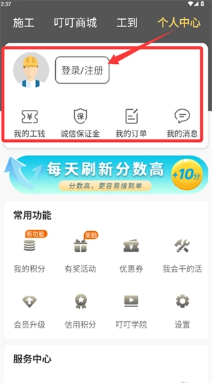 2、前往个人中心页面,完成账户的登录或注册操作。
