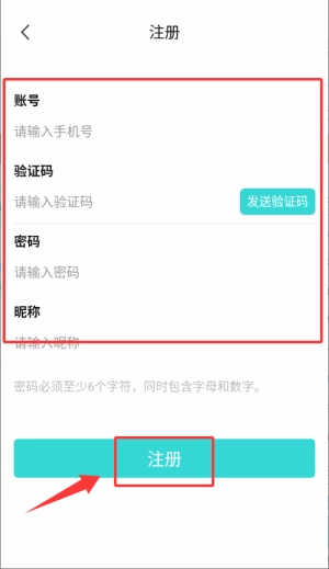 2、注册时需填写手机号、验证码、密码、昵称等信息,填写完成后点击注册按钮即可完成注册流程。