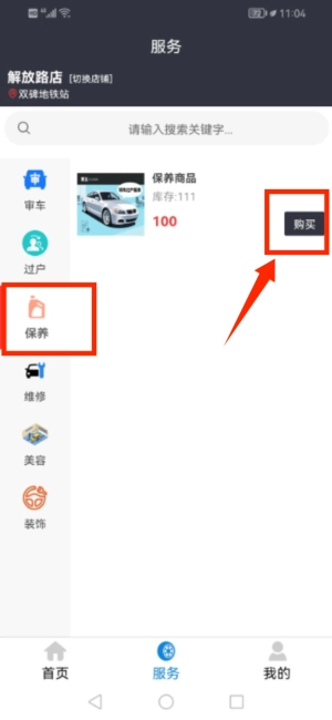 3、在保养商品旁点击购买按钮查看详情。