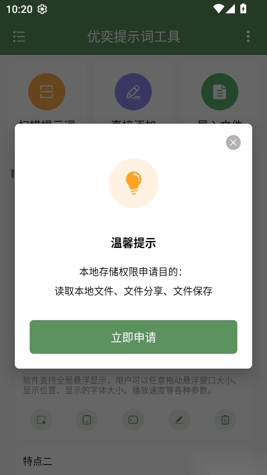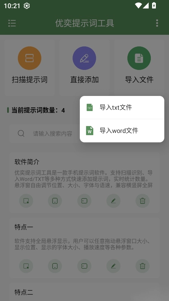 优奕提示词工具是一款具备全能手机提示器功能服务的应用软件,专业的识别扫描工具,可满足用户多场景下的文件导入与扫描识别操作需求,支持一键快速添加台词信息,提供多种实用的悬浮窗设置及位置调节方式,同时配备完善的提示词管理设置工具,允许自定义添加提示词数量;此外,优奕提示词工具免费版包含详细的使用教程步骤,能帮助新手用户快速上手;对这款软件感兴趣的用户可以直接在本站体验。