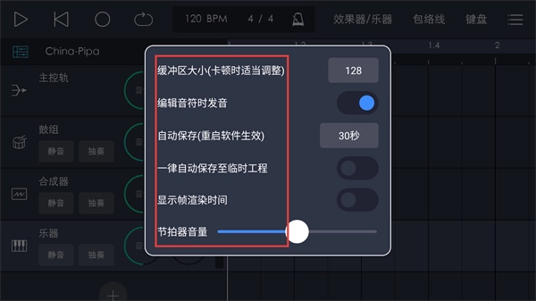 4、进入设置页面后,对【缓冲区大小】【编辑音符时发音】等需要调整的参数进行设置。