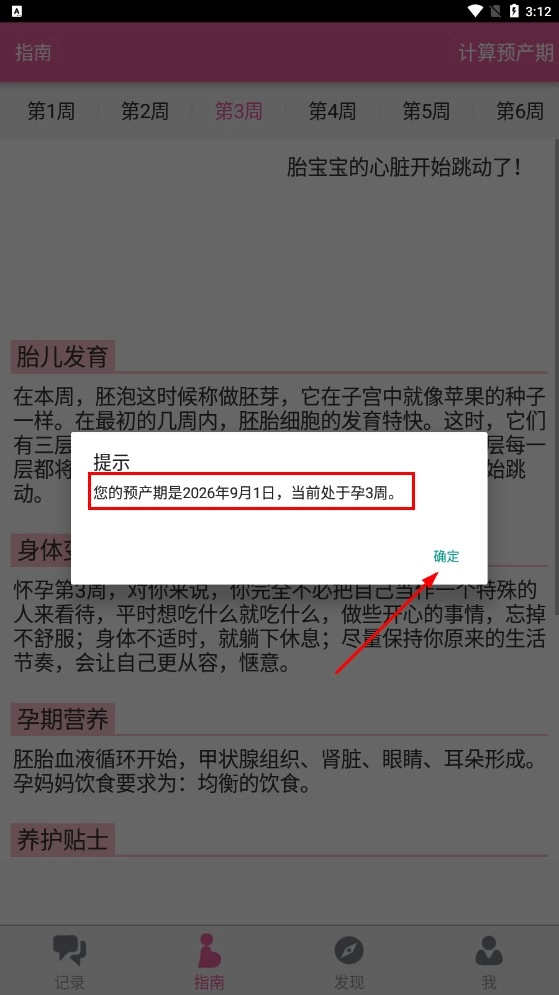 3、系统会自动计算并显示预产期和当前孕周,点击【确定】关闭提示后,即可查看该孕周对应的孕期指导内容。