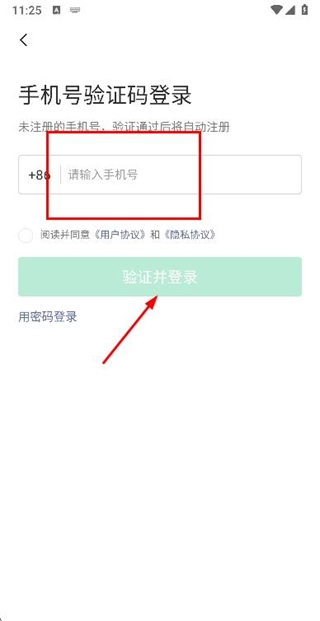 2、在手机登录界面输入手机号,勾选相关协议后,点击“验证并登录”按钮。