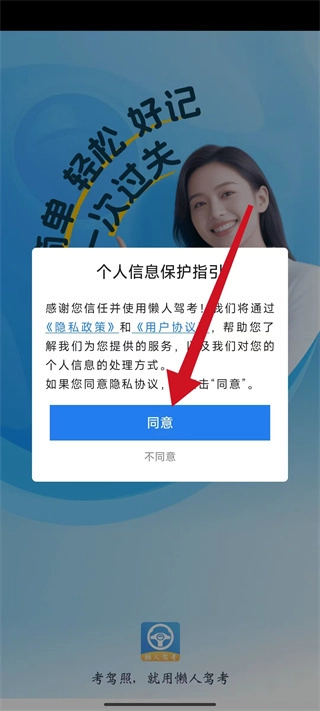 1、启动懒人驾考应用,进入应用后若出现弹窗请点击同意,随后即可进入应用主页面。