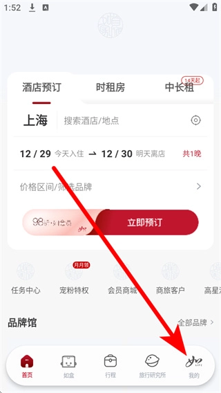 打开首旅如家酒店应用,点击底部导航栏中的“我的”选项,即可进入个人中心页面。
