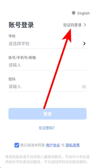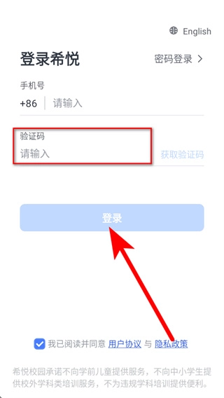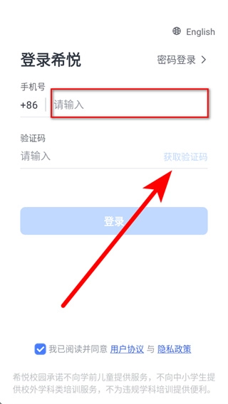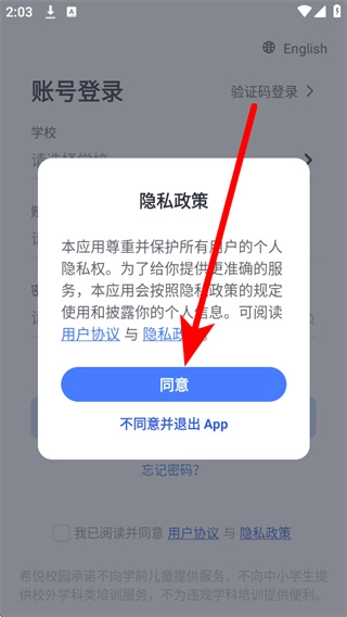 1、打开希悦校园后,弹出弹窗,点击同意,进入账号登录页面。