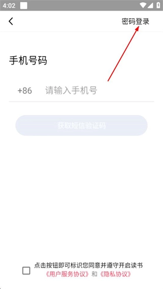 3、在登录页面,点击密码登录选项,可切换至密码登录页面。