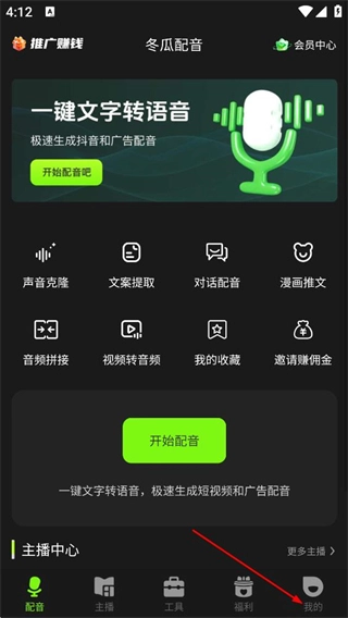 1、在冬瓜配音的配音首页,点击底部的我的选项,进入个人页面。