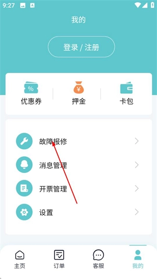 在个人中心页面,点击“故障报修”选项,即可进入故障报修页面。