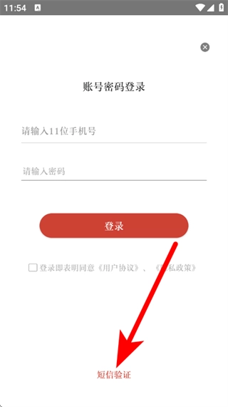 3、在账号密码登录页面,点击“短信验证”选项,即可进入短信登录注册页面。