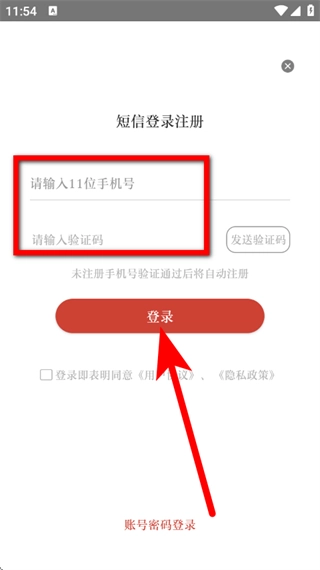4、进入短信登录注册页面后,依次填写手机号与验证码,勾选同意相关协议,随后点击登录按钮,即可完成登录操作。
