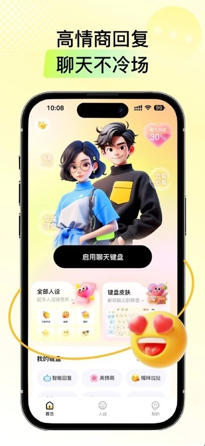 是高情商恋爱聊天回复神器,设置自己与对方的聊天亲密度,这样才可以为你进行最合理的聊天回复;面对不同的聊天对象,就可以切换最合适的键盘,让你的聊天回复更加合理。