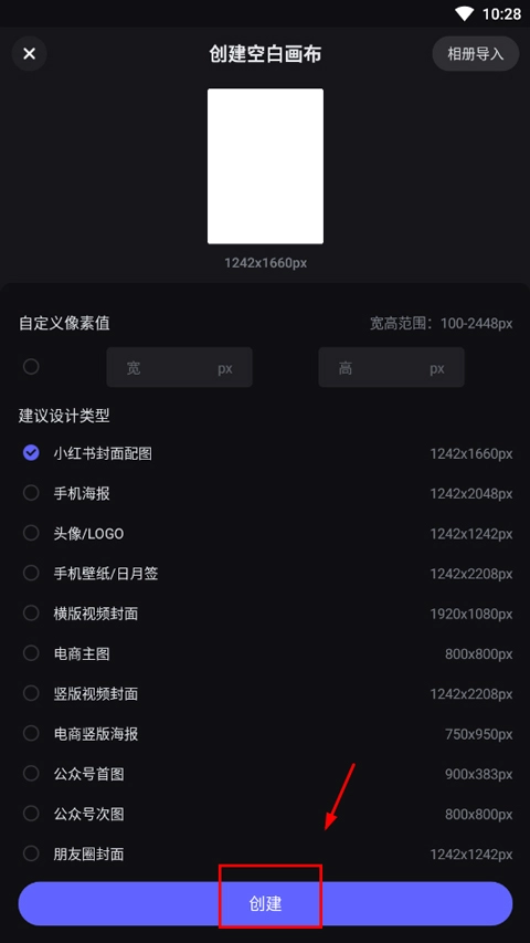 2、接着选择像素值,以及设计类型,点击创建;