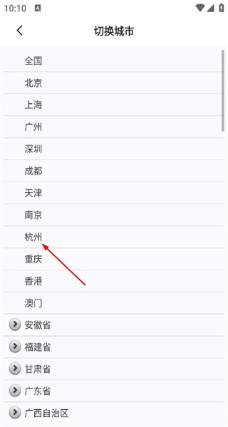 3、在城市选择界面,看到杭州等城市列表,点击杭州,准备切换到杭州的地图界面。