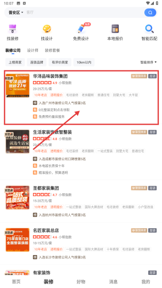 2. 在装修页面,挑选像华浔品味装饰集团这类自己感兴趣的装修公司,然后进入该品牌的详情页面。