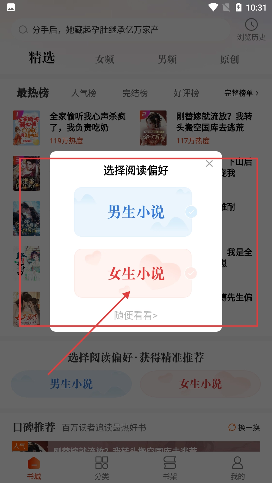 1、进入软件后,可选择【女生小说】【男生小说】或【随便看看】来设置阅读偏好,获取精准推荐。