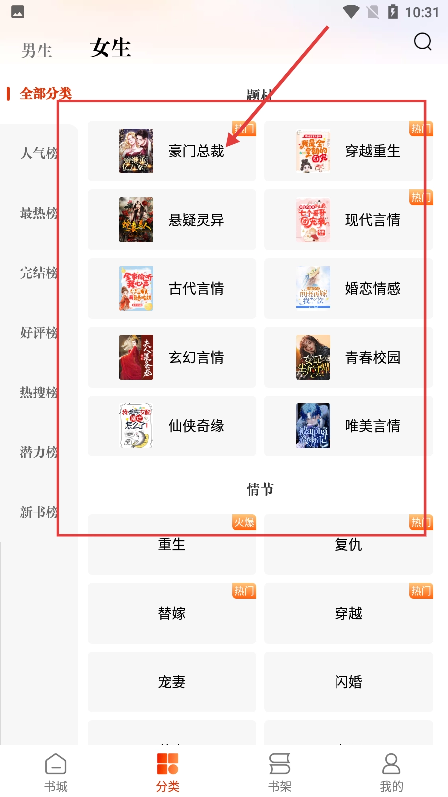 3、在女生分类页面,可选择【豪门总裁】【穿越重生】等不同小说类别,进一步筛选想看的小说类型。