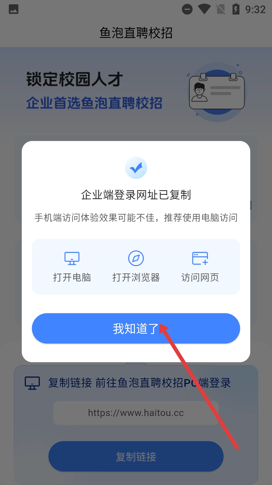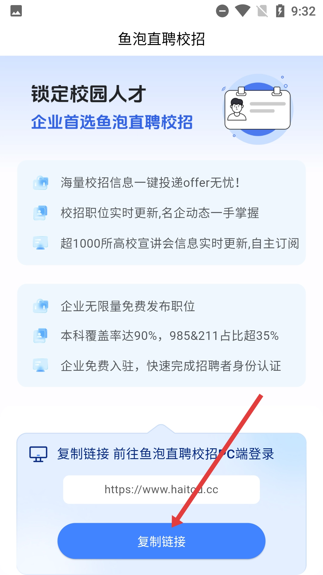 在鱼泡直聘的校招界面中,点击【复制链接】按钮,就能复制企业端的登录网址,方便后续在PC端进行登录操作。