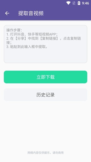 2. 点击“提取音视频”,从抖音等短视频分享处复制链接,粘贴至输入框,即可完成提取。