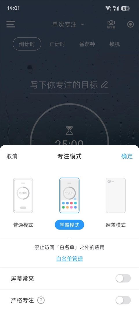 ●学霸模式:开启该模式后,你打开任何应用都会被强制切换回时光序专注页面,只有「白名单」内的应用除外;
