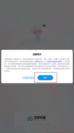 1、点击“同意”按钮,即可成功进入应用主界面,为后续的登录操作做好准备。