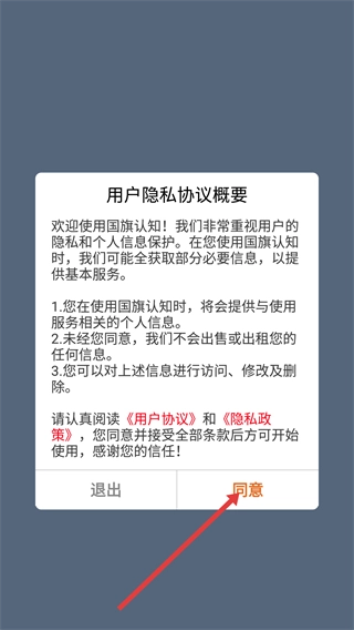 1、在国旗认知的用户隐私协议概要页面,点击【同意】按钮,即可进入国旗认知的主界面。