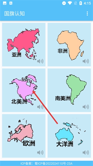 2、在主界面,点击【北美洲】板块,进入北美洲国旗列表页。