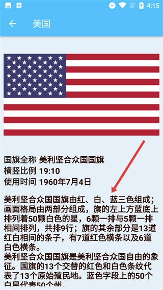 4、在详情页能够查看美国国旗的全称、比例、使用时间以及设计含义等详细信息。