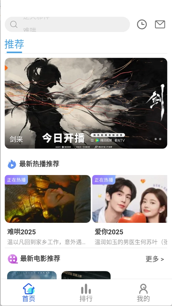 进入首页后,顶部栏陈列着丰富的影视资源,涵盖电视剧、电影和综艺等类别。