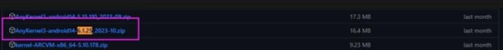 1、首先在GitHub上找到与你设备内核版本一致的AnyKernel3包。例如,小米14Pro的内核版本是6.1.25-android14,就需要找版本相同且名称以AnyKernel3开头的包。