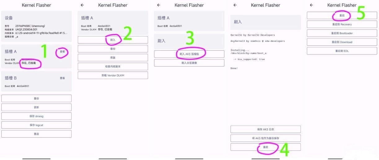 查看已挂载的插槽,依次执行刷入操作:先刷入AK3压缩包,待显示刷入成功(重启)后,重启设备即可完成刷入。