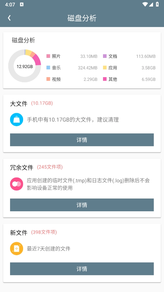 2、如图所示,在主页点击“磁盘分析”进入对应的功能页面后,就能查看各项空间占用的相关信息了。