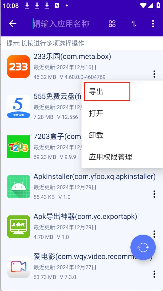 3、可直接导出用户应用和系统应用的APK文件,并支持分享操作。