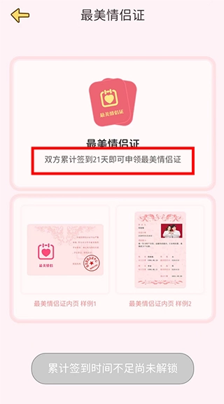 6、累计签到满21天,就能前往个人中心页面申请最美情侣证。