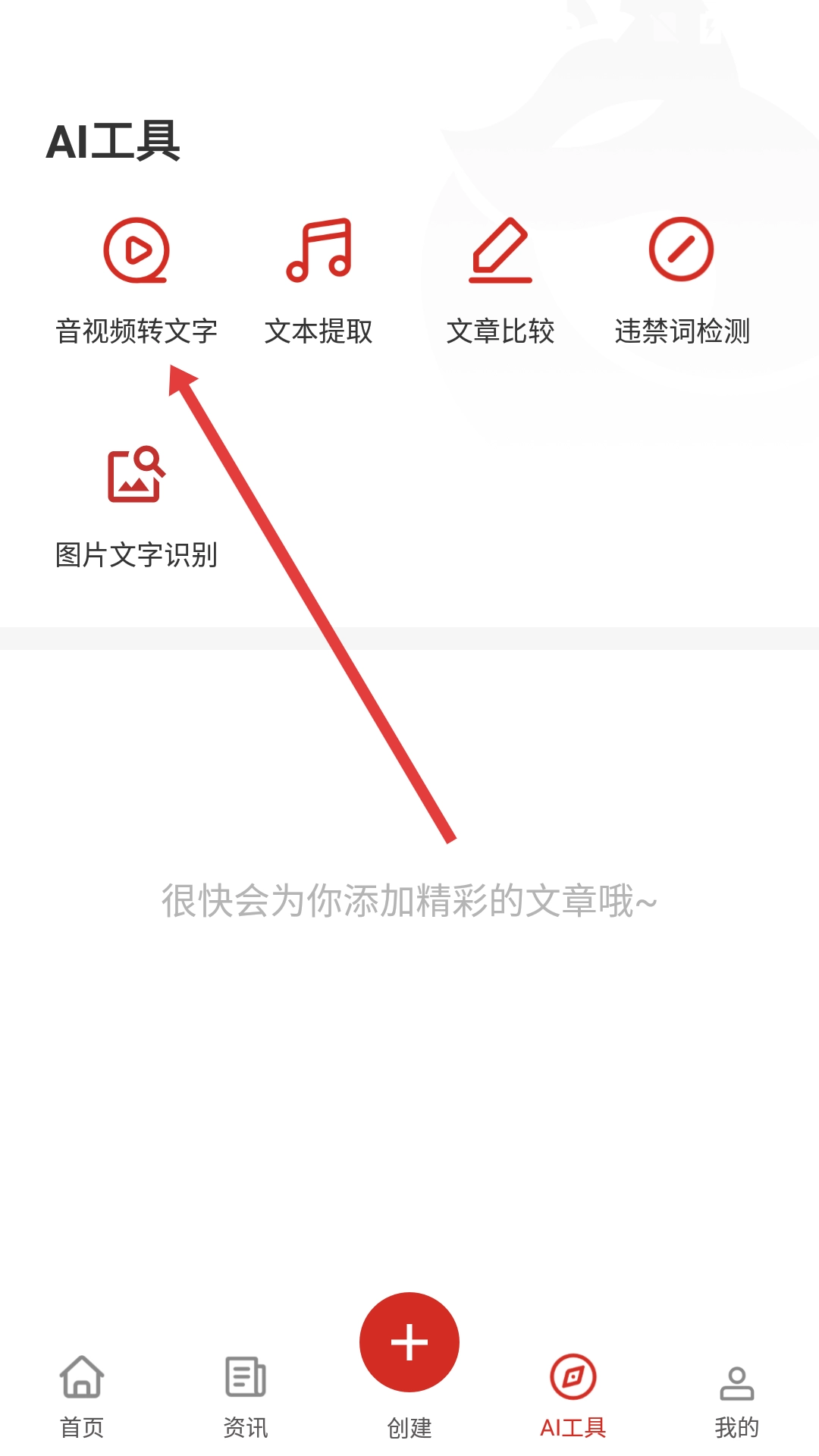 1、在首页点击【AI工具】按钮,进入AI工具板块后,就能使用音视频转文字、文本提取等各类AI功能。