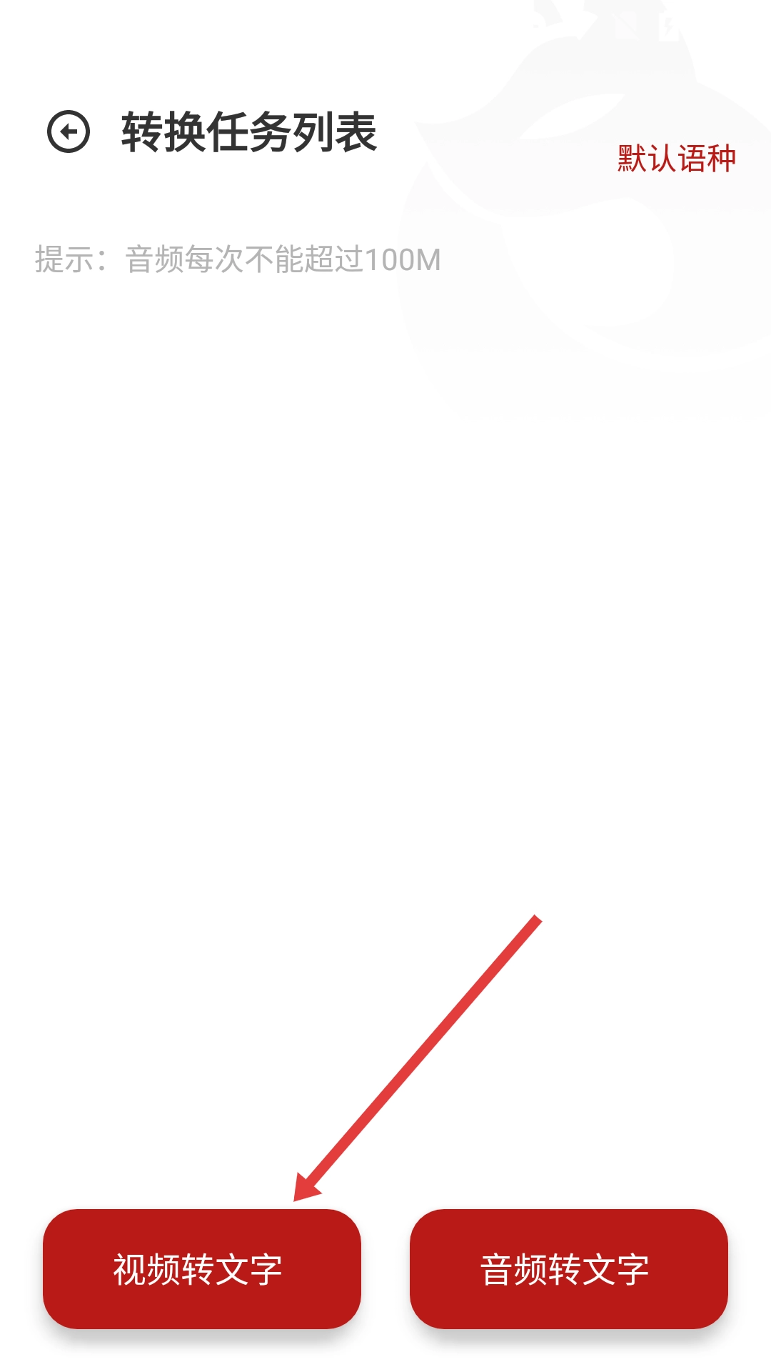 3、在转换任务列表页面,点击【视频转文字】按钮,即可进入视频选择界面。