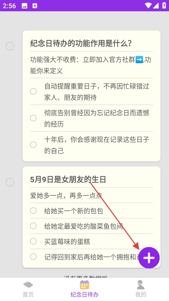 2、进入【纪念日待办】页面后,点击右下角的紫色加号按钮,即可进入纪念日待办的编辑页面。