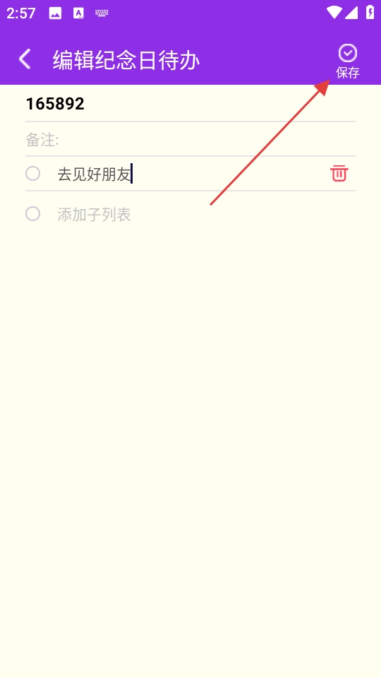 3、进入【编辑纪念日待办】页面,填写相关内容后,点击页面右上角的【保存】按钮,即可完成待办事项的编辑操作。