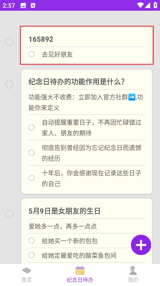 4、保存完成后,进入【纪念日待办】页面就能看到已经添加好的待办事项条目了。