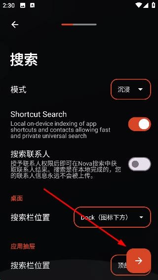 3、在【搜索】设置页面,能够对搜索模式、搜索联系人的权限、搜索栏的位置等进行设置,完成设置后点击箭头按钮即可进入下一项设置。