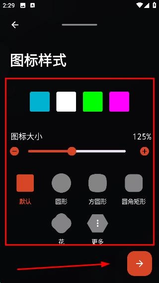 在设置向导页面的【图标样式】设置项里,可以对图标颜色、大小、形状等进行调整,各项设置完成后,点击箭头按钮就能进入下一项设置。
